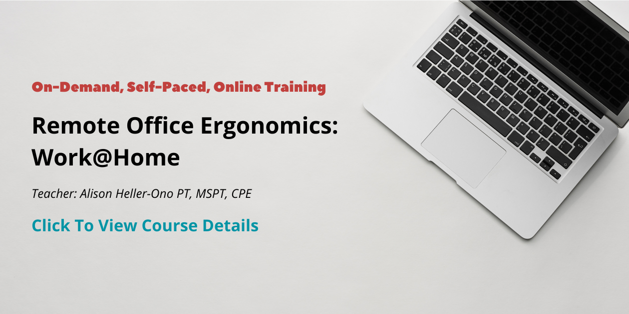 1. Online Work from Home (WFH) Ergonomics education and training either as a webinar or as a self-paced, on-demand course, so that employees can set up their home work space effectively with ergonomics strategies using quick fixes and home accommodations.